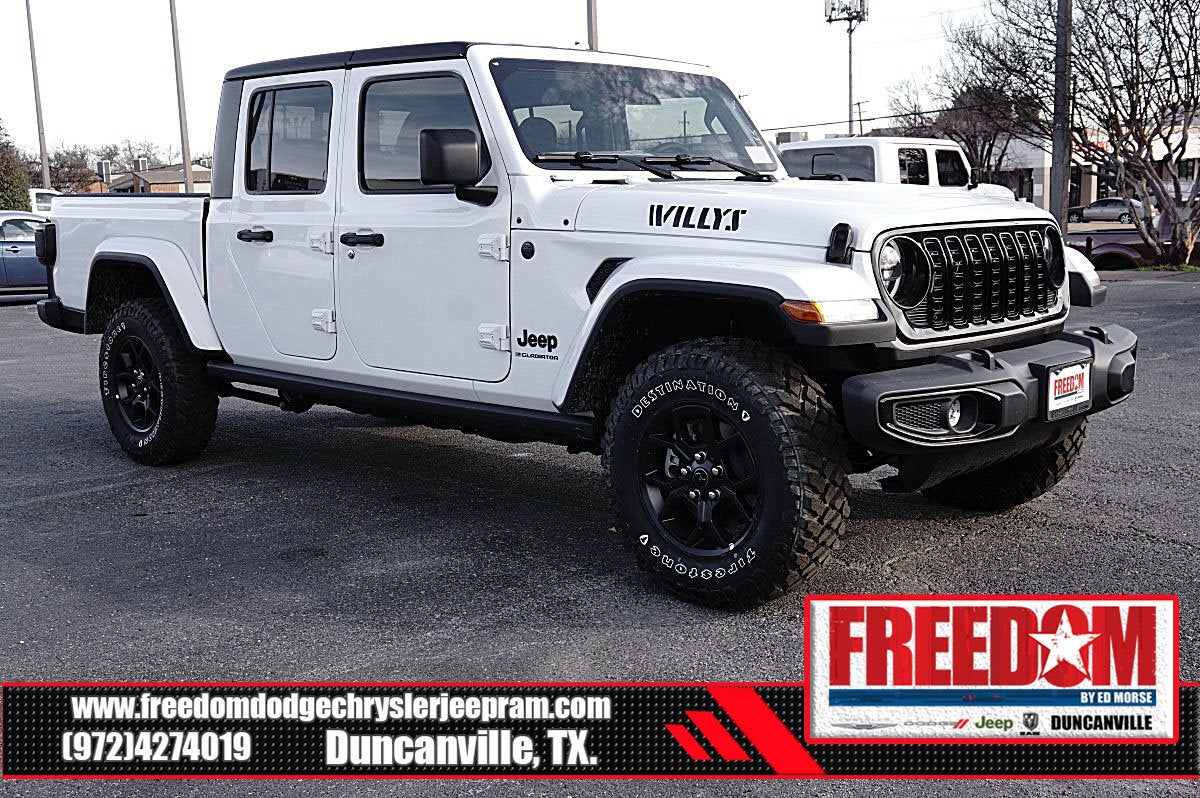 Big cash and no payments for 90 days! Our only Dealership add is GREAT CUSTOMER SERVICE. Real Deals, No Games and No Surprises. Price Includes only Rebates EVERYONE Qualifies for. We Make it Easy No Games. Equipped with Quick Order Package 24W Willys (2-Piece Body Color Fender Flares, 4-Wheel Drive Decal, Advanced Brake Assist, Air Conditioning with Auto Temp Control, Automatic Headlamps, Auxiliary Switches, Black Grille with Gloss Black Rings, Class IV Receiver Hitch, Cluster 7.0 TFT Color Display, Corning Gorilla Glass, Daytime Running Lamps LED Accents, Deep Tint Sunscreen Windows, E-Locker Rear Axle, Front Door Locks 2-Door Passive Entry, Front Heavy Duty Red Accent Shock Absorbers, Front LED Fog Lamps, Full Speed Forward Collision Warning Plus, Heavy-Duty Engine Cooling, LED Premium Reflector Headlamps, LED Taillamps, Mold in Color Bumper with Gloss Black, MOPAR All-Weather Slush Mats, Off-Road Plus Mode, Power Heated Mirrors, Premium Wrapped Steering Wheel, Protection Sill Rails, Rear Heavy Duty Red Accent Shock Absorbers, Security Alarm, Sun Visors with Illuminated Vanity Mirrors, Trailer Hitch Zoom, Wheels: 17 x 7.5 Painted Black, Willys Hood Decal, and Willys Suspension), 110 Mph Vehicle Max Speed Calibration, 12.3 Touchscreen Display, 3.73 Rear Axle Ratio, 4-Wheel Disc Brakes, 4G LTE Wi-Fi Hot Spot, 8 Speakers, ABS brakes, Air Conditioning, Alexa Built-in, AM/FM radio: SiriusXM with 360L, Apple CarPlay, Apple CarPlay/Android Auto, Black 3-Piece Hard Top, Brake assist, Compass, Connectivity - US/Canada, Delay-off headlights, Driver door bin, Driver vanity mirror, Dual front impact airbags, Dual front side impact airbags, Electronic Stability Control, For Details, Visit DriveUconnect.com, Freedom Panel Storage Bag, Front anti-roll bar, Front Bucket Seats, Front Center Armrest w/Storage, Front fog lights, Front License Plate Bracket, Front reading lights, Google Android Auto, Illuminated entry, Integrated Center Stack Radio, Integrated roll-over protection, Low tire pressure warning, Manufacturer's Statement of Origin, Normal Duty Suspension, Occupant sensing airbag, Outside temperature display, Overhead airbag, Panic alarm, ParkView Rear Back-Up Camera, Passenger door bin, Passenger vanity mirror, Power steering, Power windows, Radio data system, Radio: Uconnect 5 with 12.3 Display, Rear anti-roll bar, Rear reading lights, Rear Sliding Window, Rear Window Defroster, Remote keyless entry, SiriusXM Radio Service, SiriusXM with 360L, Speed control, Split folding rear seat, Steering wheel mounted audio controls, Tachometer, Telescoping steering wheel, Tilt steering wheel, Traction control, Trip computer, USB Host Flip, Variably intermittent wipers, Voltmeter, and Wheels: 17 x 7.5 Black Steel Styled Freedom uses very reasonable effort to ensure the accuracy of information, we are not responsible for any errors or omissions contained on these pages. Please verify any information in question with Freedom Chrysler Dodge Jeep Ram * Images, prices, and options shown, including vehicle color, trim, options, pricing and other specifications are subject to availability, incentive offerings, current pricing and credit worthiness. * MSRP is the Manufacturer's Suggested Retail Price (MSRP) of the vehicle. It does not include any taxes, fees or other charges. Pricing and availability may vary based on a variety of factors, including options, dealer, specials, fees, and financing qualifications. Consult your dealer for actual price and complete details. Vehicles shown may have optional equipment at an additional cost. * The estimated selling price that appears after calculating dealer offers is for informational purposes, only. You may not qualify for the offers, incentives, discounts, or financing. Not all rebates are compatible with each other. Offers, incentives, discount Price includes: $1000 - 2026 National Stellantis Loyalty Bonus Cash . Exp. 03/0