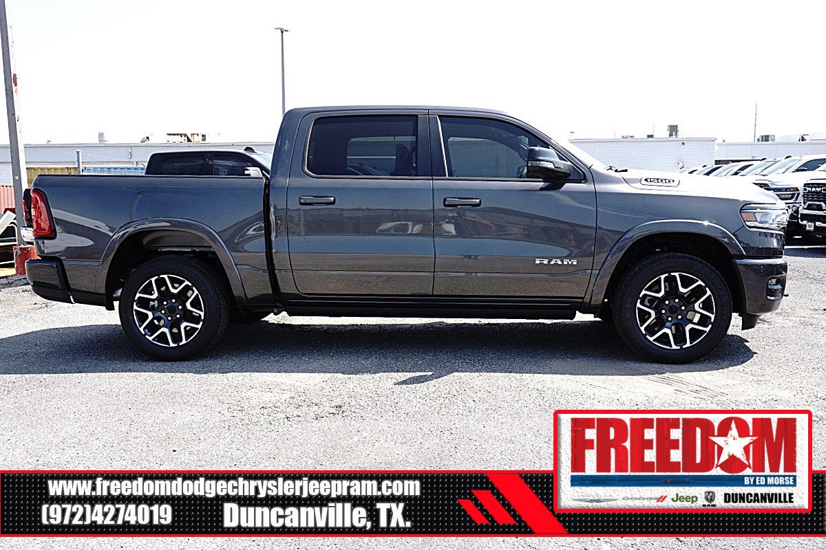 Big cash and no payments for 90 days! Our only Dealership add is GREAT CUSTOMER SERVICE. Real Deals, No Games and No Surprises. Price Includes only Rebates EVERYONE Qualifies for. We Make it Easy No Games. Equipped with Laramie Level 1 Equipment Group (Rain Sensitive Windshield Wipers and Remote Tailgate Release), Laramie Southwest Edition (Accent Color Premium Power Mirrors, Auto Power-Folding Mirrors, Auto-Dimming Exterior Driver Mirror, Black Painted Exterior Mirrors Caps, Body Color Front Bumper, Body Color Rear Bumper with Step Pads, Convex Wide-Angle Exterior Mirror Insert, Dome Dual LED Reading Lamp, Dual-Pane Panoramic Sunroof, Exterior Mirrors Courtesy Lamps, Exterior Mirrors with Heating Element, Exterior Mirrors with Memory, Exterior Mirrors with Supplemental Signals, Grille Surround 3 Body Color Tex 4 Chrome, LED Dome/Reading Lamp, MOPAR Lockable Console Storage, Power Deployable Running Boards, RAM Grille Badge - Chrome, Tow Hooks, and Trailer Brake Control), Quick Order Package 21H Laramie, 10 Speakers, 3.55 Rear Axle Ratio, 33 Gallon Fuel Tank, 4-Wheel Disc Brakes, 4G LTE Wi-Fi Hot Spot, ABS brakes, Active Noise Control System, Adjustable pedals, Air Conditioning, Alloy wheels, AM/FM radio: SiriusXM with 360L, Anti-Spin Differential Rear Axle, Apple CarPlay/Android Auto, Audio memory, Auto High-beam Headlights, Auto-dimming door mirrors, Auto-dimming Rear-View mirror, Automatic temperature control, Brake assist, Bumpers: chrome, Chrome Exterior Mirrors, Compass, Connected Travel and Traffic Services, Connectivity - US/Canada, Delay-off headlights, Driver door bin, Driver vanity mirror, Dual front impact airbags, Dual front side impact airbags, Electronic Stability Control, Front anti-roll bar, Front Bucket Seats, Front Center Armrest w/Storage, Front dual zone A/C, Front fog lights, Front License Plate Bracket, Front reading lights, Front wheel independent suspension, Fully automatic headlights, Garage door transmitter, GPS Navigation, Heated door mirrors, Heated front seats, Heated rear seats, Heated steering wheel, Illuminated entry, Integrated Center Stack Radio, Integrated Voice Command with Bluetooth®, Leather steering wheel, Leather Trimmed Bucket Seats, Low tire pressure warning, Memory seat, Navigation System, Occupant sensing airbag, Off-Road Information Pages, Outside temperature display, Overhead airbag, Overhead console, Panic alarm, ParkView Rear Back-Up Camera, Passenger door bin, Passenger vanity mirror, Pedal memory, Power door mirrors, Power driver seat, Power passenger seat, Power steering, Power windows, Radio data system, Radio: Uconnect 5 Navigation with 12.0 Display, Rear anti-roll bar, Rear reading lights, Rear seat center armrest, Rear step bumper, Remote keyless entry, Security system, SiriusXM Radio Service, SiriusXM with 360L, Speed control, Split folding rear seat, Steering wheel mounted audio controls, Tachometer, Telescoping steering wheel, Tilt steering wheel, Traction control, Trip computer, Turn signal indicator mirrors, USB Host Flip, Variably intermittent wipers, Ventilated front seats, Voltmeter, and Wheels: 20 x 9 Premium Paint/Polish Freedom uses very reasonable effort to ensure the accuracy of information, we are not responsible for any errors or omissions contained on these pages. Please verify any information in question with Freedom Chrysler Dodge Jeep Ram * Images, prices, and options shown, including vehicle color, trim, options, pricing and other specifications are subject to availability, incentive offerings, current pricing and credit worthiness. * MSRP is the Manufacturer's Suggested Retail Price (MSRP) of the v Price includes: $1000 - 2026 Southwest BC State of Texas Regional Bonus Cash . Exp. 04/30/2026 $3500 - 2026 National Retail Bonus Cash . Exp. 04/30/2026 $500 - 2026 National 2026 Military Bonus Cash . Exp. 01/04/2027 $750 - 2026 Southwest BC Retail Bonus Cash . Exp. 04/3