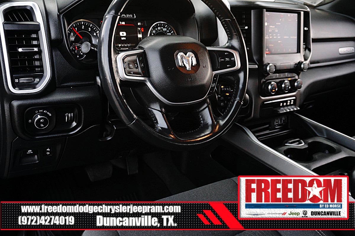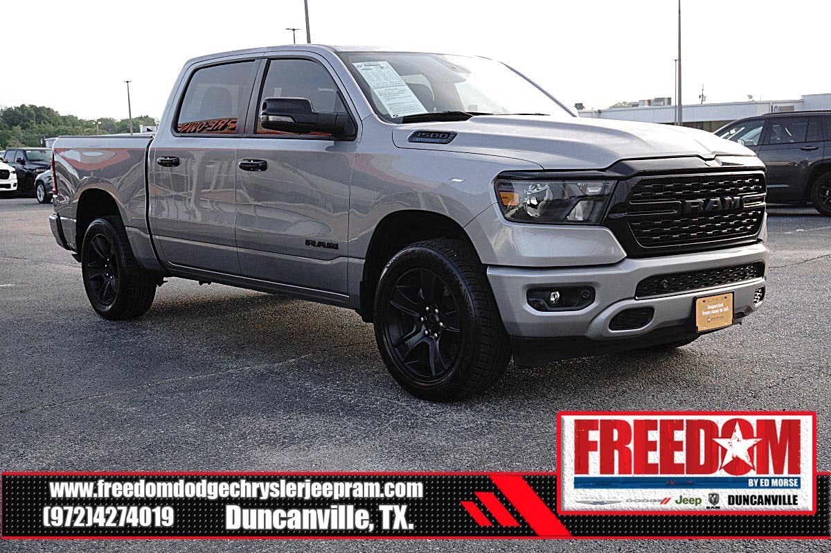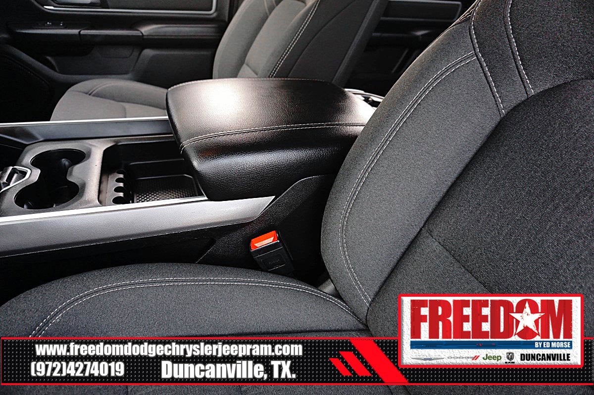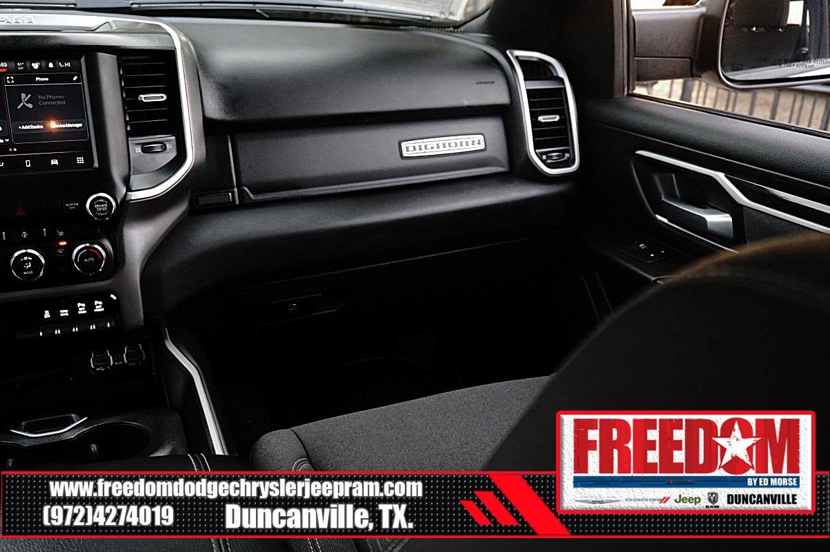 Equipped with Big Horn Level 2 Equipment Group (DISC) (115V Auxiliary Power Outlet, 2nd Row In Floor Storage Bins, 400W Inverter, 4G LTE Wi-Fi Hot Spot, 8.4 Touchscreen Display, 9 Amplified Speakers w/Subwoofer, Air Conditioning ATC w/Dual Zone Control, Apple CarPlay, Auto-Dimming Exterior Driver Mirror, Auto-Dimming Rear-View Mirror, Black Exterior Mirrors, Black Premium Power Mirrors, Bluetooth® Handsfree Phone & Audio, Class IV Receiver Hitch, Cluster 7.0 TFT Color Display, Connectivity - US/Canada, Convex Wide-Angle Exterior Mirror Insert, Electric Shift-On-Demand Transfer Case, Exterior Mirrors Courtesy Lamps, Exterior Mirrors w/Heating Element, Exterior Mirrors w/Supplemental Signals, For Details, Visit DriveUconnect.com, For More Info, Call 800-643-2112, Front Fog Lamps, Glove Box Lamp, Google Android Auto, GPS Antenna Input, Heated Front Seats, Heated Steering Wheel, Integrated Center Stack Radio, LED Footwell Lighting, Media Hub w/2 Charge Only USBs, ParkSense Front/Rear Park Assist w/Stop, Power 2-Way Driver Lumbar Adjust, Power 8-Way Driver Seat, Power Adjustable Pedals, Power-Folding Mirrors, Radio: Uconnect 5 W w/8.4 Display, Rear Dome w/On/Off Switch Lamp, Rear Power Sliding Window, Rear Window Defroster, Remote Start System, Security Alarm, SiriusXM Satellite Radio, Sun Visors w/Illuminated Vanity Mirrors, Universal Garage Door Opener, and USB Host Flip), Night Edition (3 Rear Seat Head Restraints, 4 Way Front Headrests, Accent Color Door Handles, Accent Color Premium Power Mirrors, Anti-Spin Differential Rear Axle, Black Exterior Truck Badging, Black Headlamp Bezels, Black Interior Accents, Black Painted Exterior Mirrors Caps, Body Color Front Bumper, Body Color Rear Bumper w/Step Pads, Bucket Seats, Center Console Parts Module, Deluxe Cloth Bucket Seats, Dual Exhaust w/Black Tips, Front Seat Back Map Pockets, Full Length Floor Console, Manual Adjust 4-Way Front Passenger Seat, RAM Grille Badge - Black, Rear 60/40 Folding Seat, Rear Center Armrest, and Wheels: 20 x 9.0 Premium Paint/Polished), Quick Order Package 23Z Big Horn (Big Horn Badge), 3.21 Rear Axle Ratio, 33 Gallon Fuel Tank, 4-Wheel Disc Brakes, 48V Belt Starter Generator, 6 Speakers, ABS brakes, Air Conditioning, Alloy wheels, AM/FM radio, Brake assist, Bumpers: chrome, Cloth Bench Seat, Compass, Delay-off headlights, Driver door bin, Dual front impact airbags, Dual front side impact airbags, Electronic Stability Control, Emergency communication system: SiriusXM Guardian, Front anti-roll bar, Front Center Armrest w/Storage, Front License Plate Bracket, Front reading lights, Front wheel independent suspension, Fully automatic headlights, Global Telematics Box Module (TBM), Heated door mirrors, Illuminated entry, Integrated Voice Command w/Bluetooth®, Leather steering wheel, Low tire pressure warning, MOPAR Front & Rear Rubber Floor Mats, Occupant sensing airbag, Outside temperature display, Overhead airbag, Overhead console, Panic alarm, ParkView Rear Back-Up Camera, Passenger door bin, Passenger vanity mirror, Power door mirrors, Power steering, Power windows, Radio data system, Radio: Uconnect 3 w/5 Display, RAM Grille Badge - Chrome, Rear anti-roll bar, Rear seat center armrest, Rear step bumper, Remote keyless entry, Speed control, Split folding rear seat, Steering wheel mounted audio controls, Tachometer, Telescoping steering wheel, Tilt steering wheel, Traction control, Trip computer, Variably intermittent wipers, Voltmeter, and Wheels: 18 x 8 Cast-Aluminum PainteD.